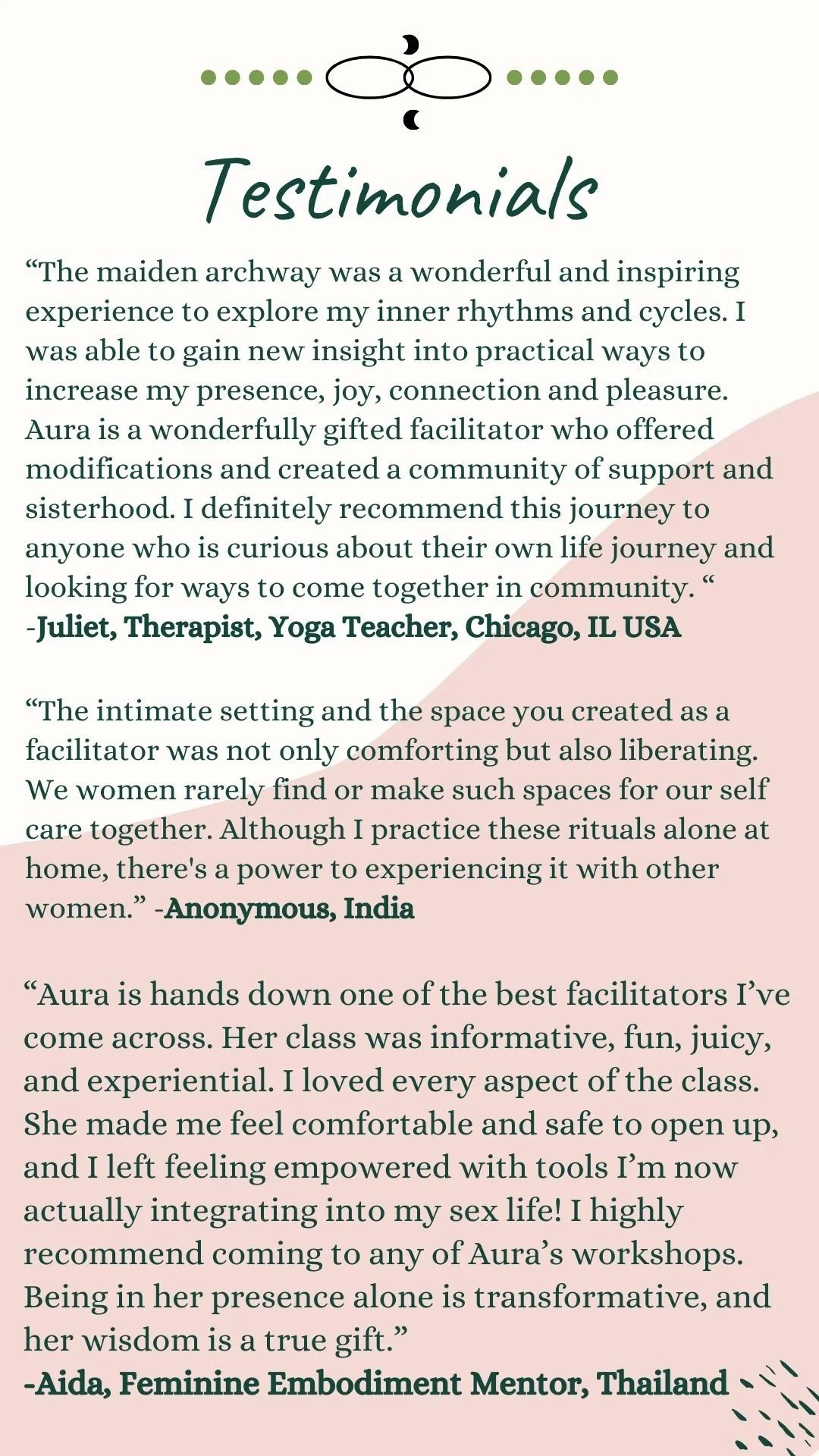 Each session is guided based on your current needs with the founding principle that you are your own healer and know what's in your best interest. I am here as a guide to support the awakening of your inner knowing and deepening your connection to your womb space.